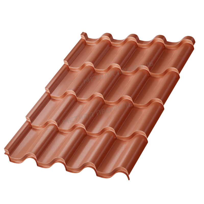 Профиль Монтерроса-XL характеризуется увеличенной шириной волны, что придает кровле выразительный рельеф, напоминающий классическую керамическую черепицу. Высота волны достигает 25 мм, а шаг – 400 мм, что обеспечивает оптимальную жесткость и простоту монтажа. Этот профиль подходит для крыш с уклоном от 12 градусов, минимизируя количество стыков и повышая герметичность. В сочетании с толщиной металла 0,5 мм он выдерживает значительные снеговые и ветровые нагрузки, делая его идеальным для регионов с суровым климатом. Медный металлик оттенок подчеркивает текстуру, создавая эффект натурального металла.